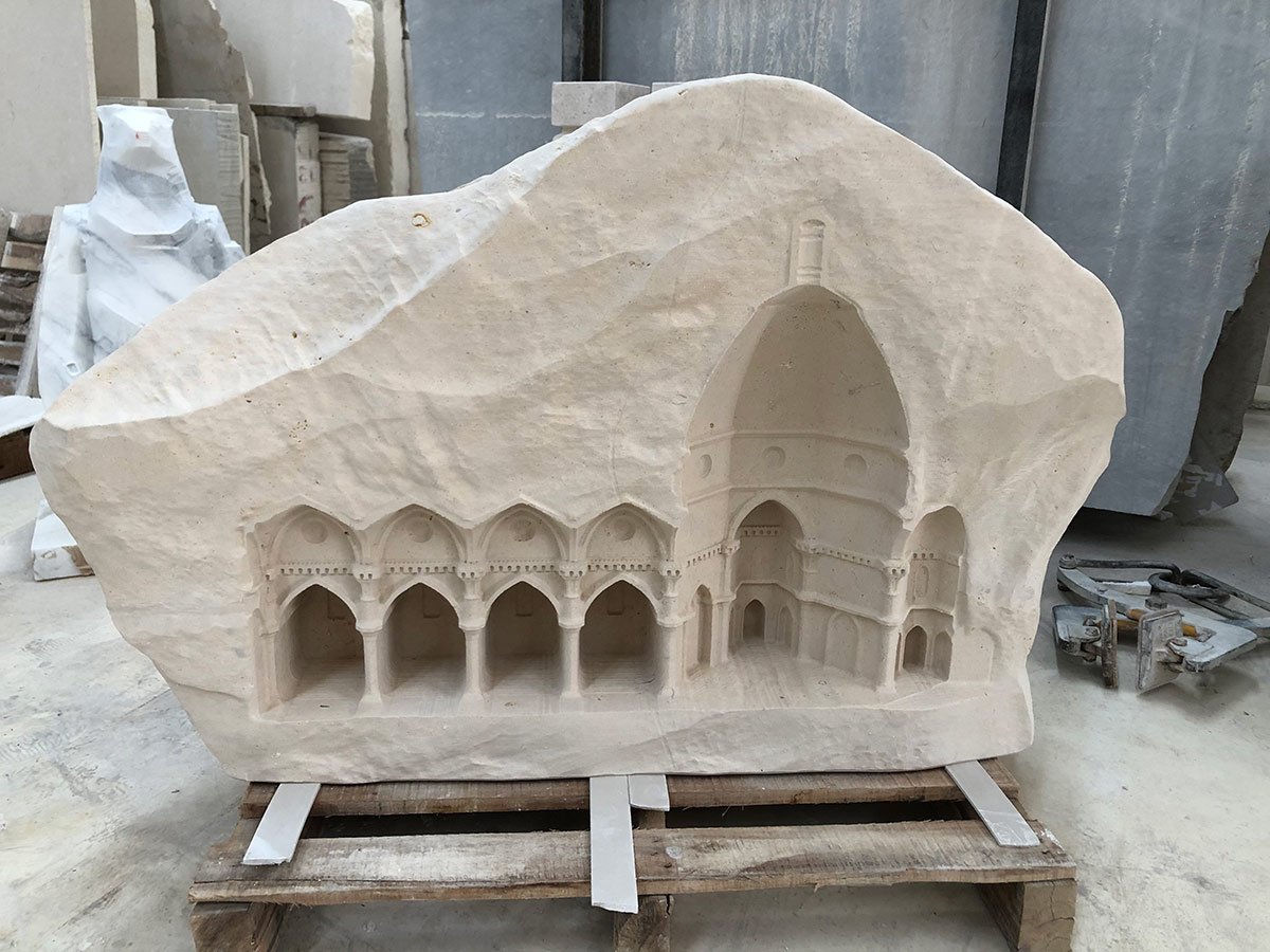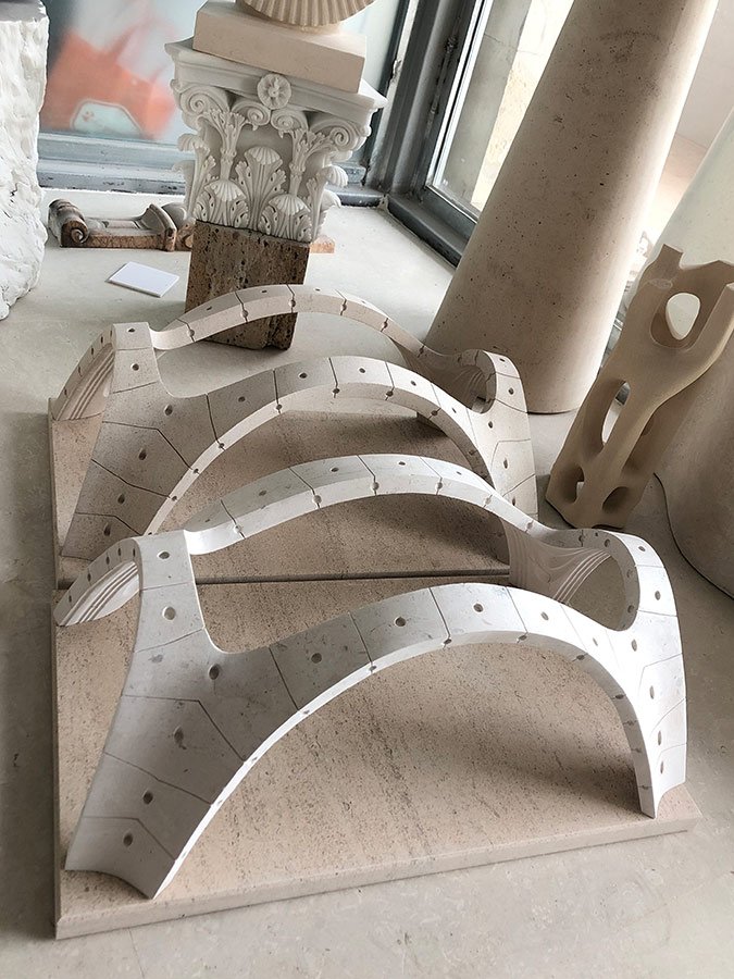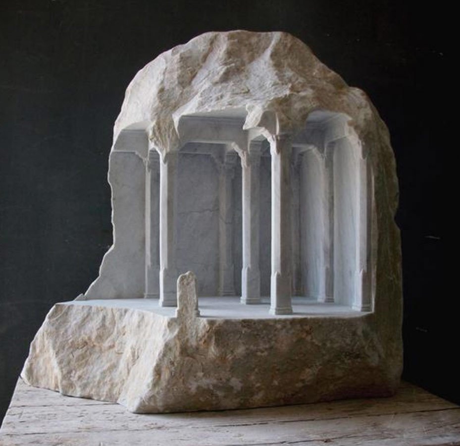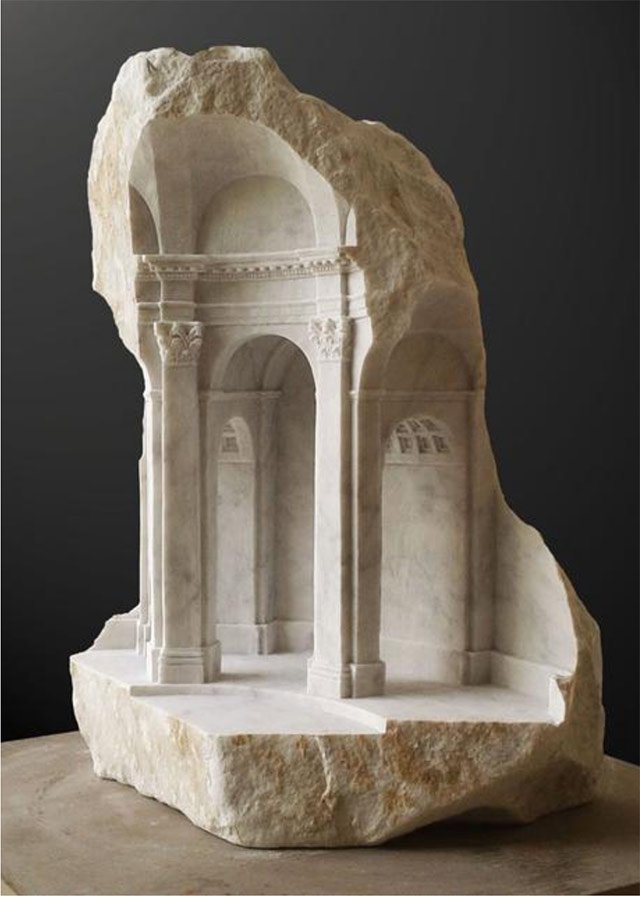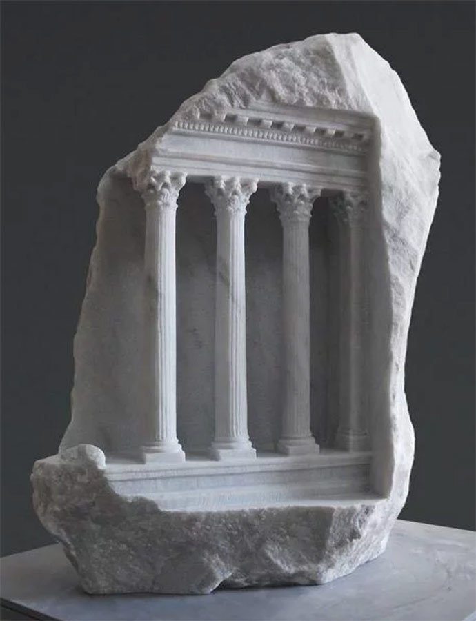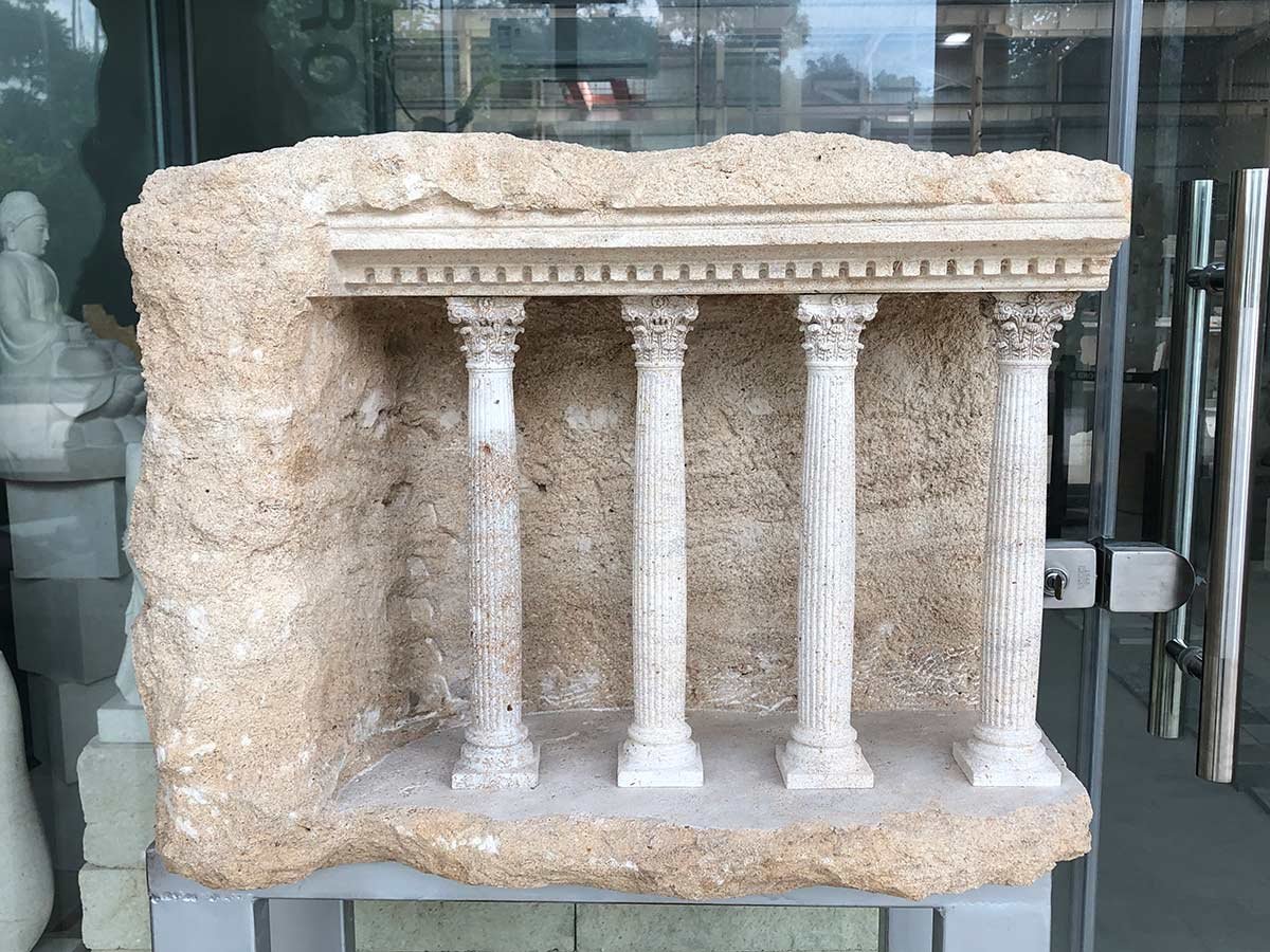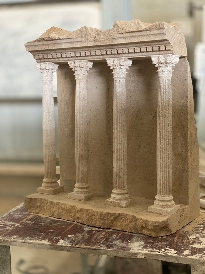 Miniature replicas of classical architectural structures made from solid limestone blocks.
