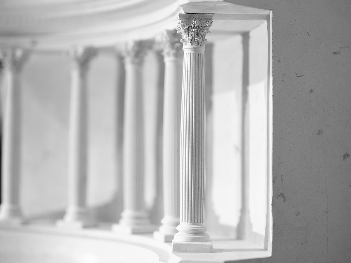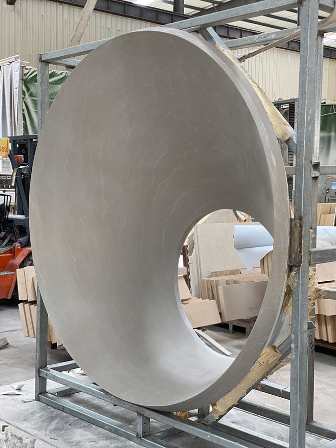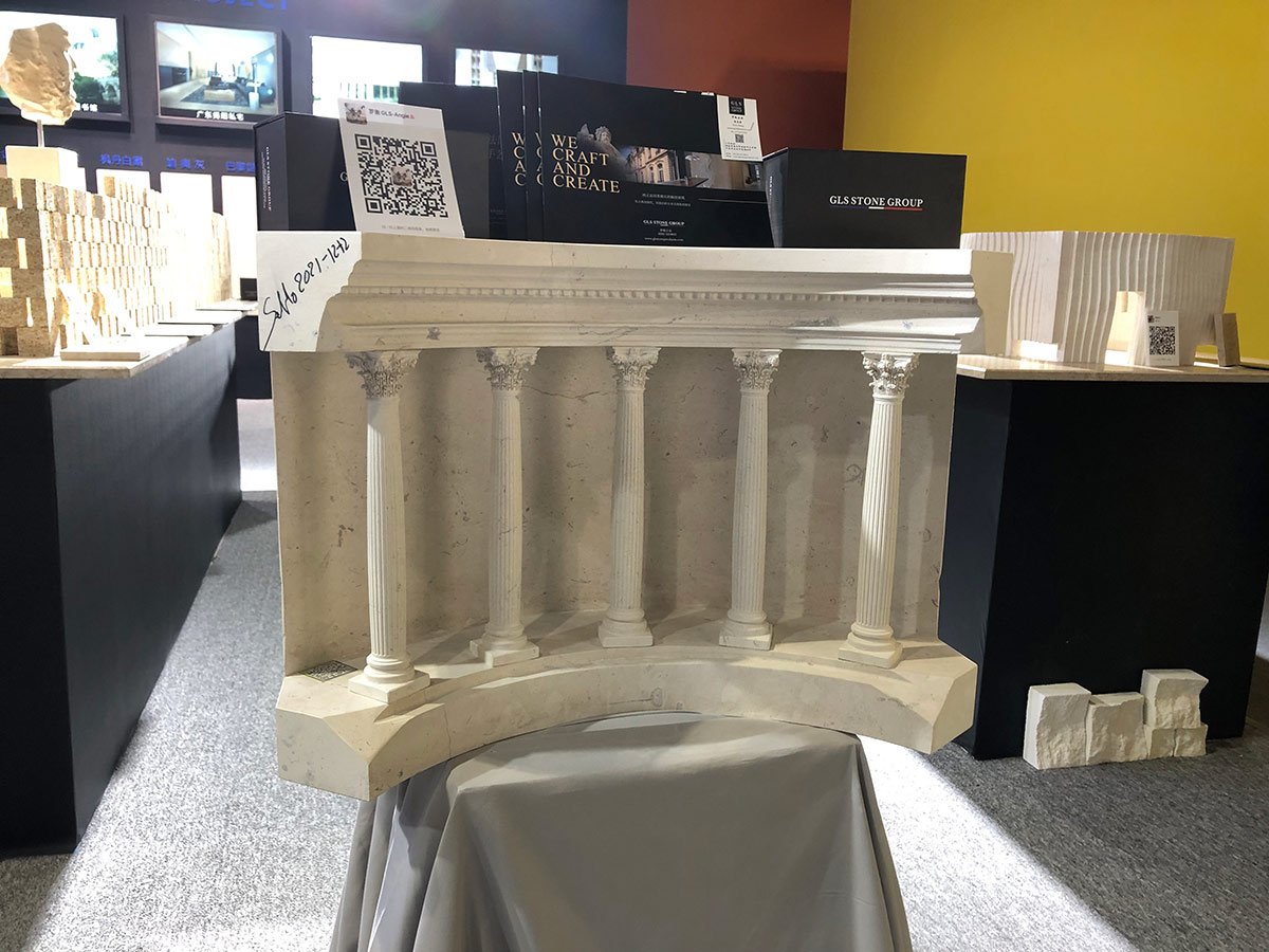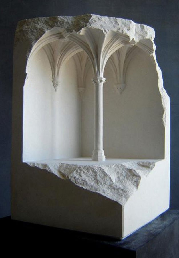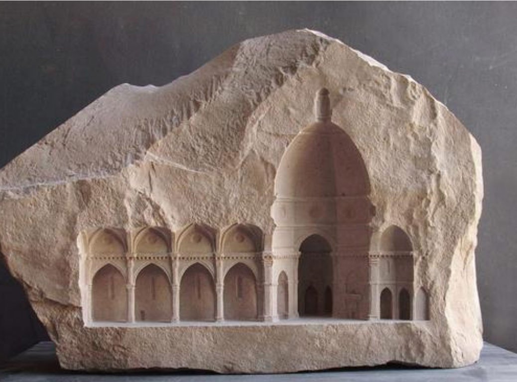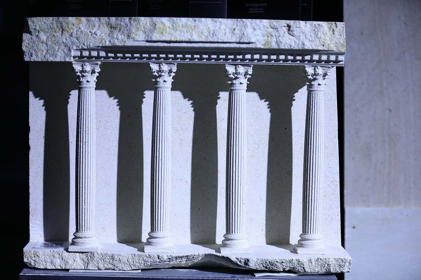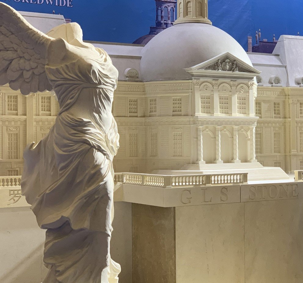 Miniature replicas of classical architectural structures made from solid limestone blocks.